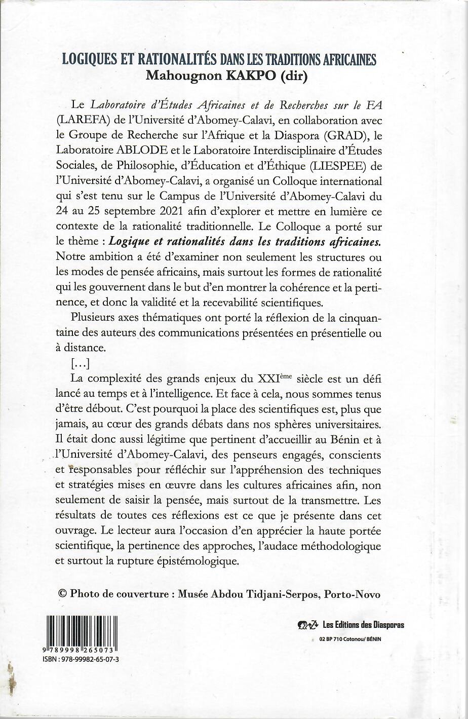 Le Laboratoire d’Études Africaines et de Recherches sur le FA (LAREFA) de l’Université d’Abomey-Calavi, en collaboration avec le Groupe de Recherche sur l’Afrique et la Diaspora (GRAD), le Laboratoire ABLODE et le Laboratoire Interdisciplinaire d’Études Sociales, de Philosophie, d’Éducation et d’Éthique (LIESPEE) de l’Université d’Abomey-Calavi, a organisé un Colloque international qui s’est tenu sur le Campus de l’Université d’Abomey-Calavi du 24 au 25 septembre 2021 afin d’explorer et mettre en lumière ce contexte de la rationalité traditionnelle. Le Colloque a porté sur le thème: Logique et rationalités dans les traditions africaines. Notre ambition a été d’examiner non seulement les structures ou les modes de pensée africains, mais surtout les formes de rationalité qui les gouvernent dans le but d’en montrer la cohérence et la pertinence, et donc la validité et la recevabilité scientifiques.