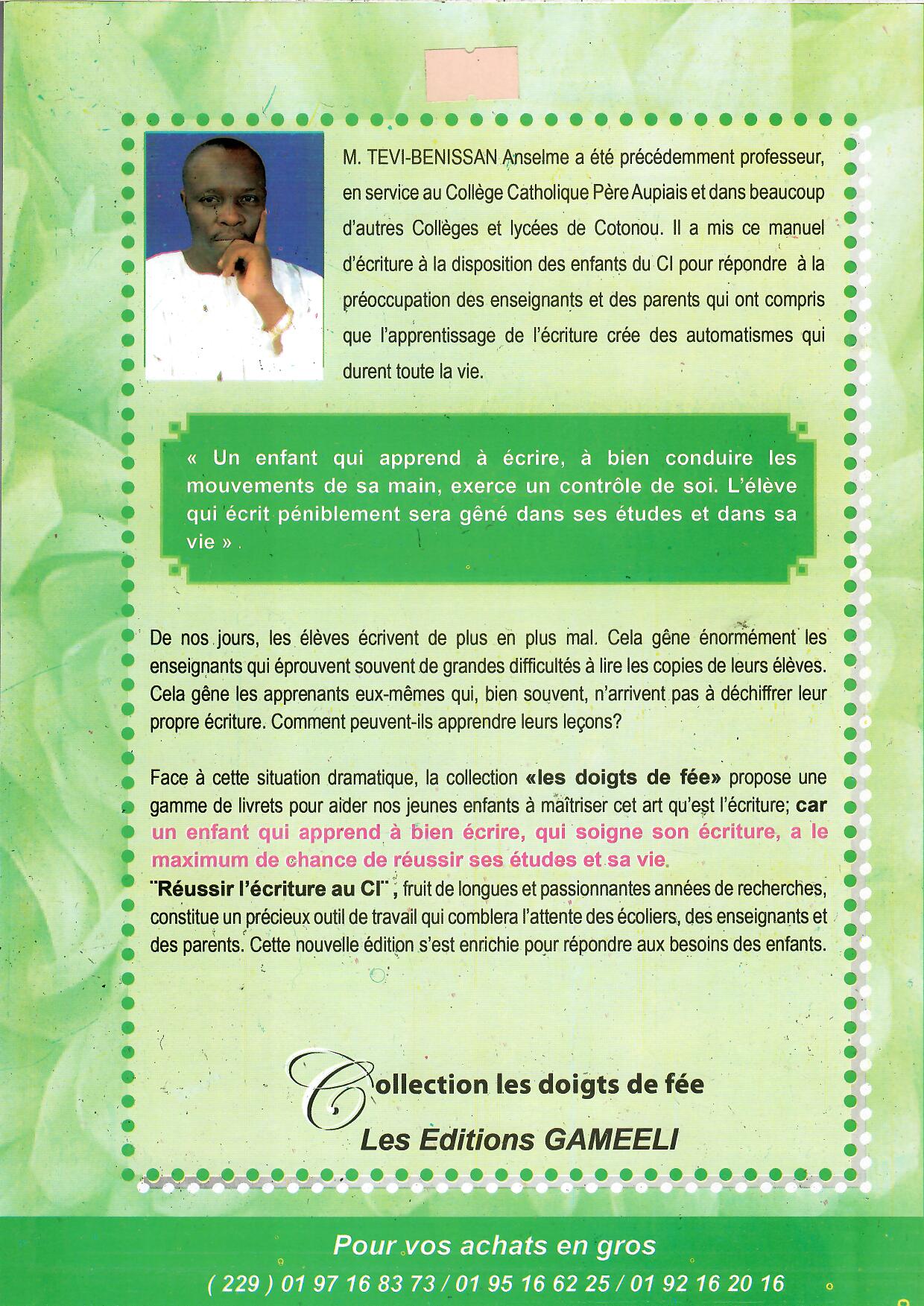 M. TEVI-BENISSAN Anselme a été précédemment professeur en service au collège Père Aupiais et dans beaucoup d’autres collèges et lycées de Cotonou. Il a mis ce manuel de dessin à la disposition des écoliers du CI pour combler quelques insuffisances au niveau de l’enseignement du dessin car, le diagnostic de l’enseignement du dessin dans les écoles primaires africaines révèle un véritable manque d’efficacité à cause surtout de l’absence d’un support pédagogique.